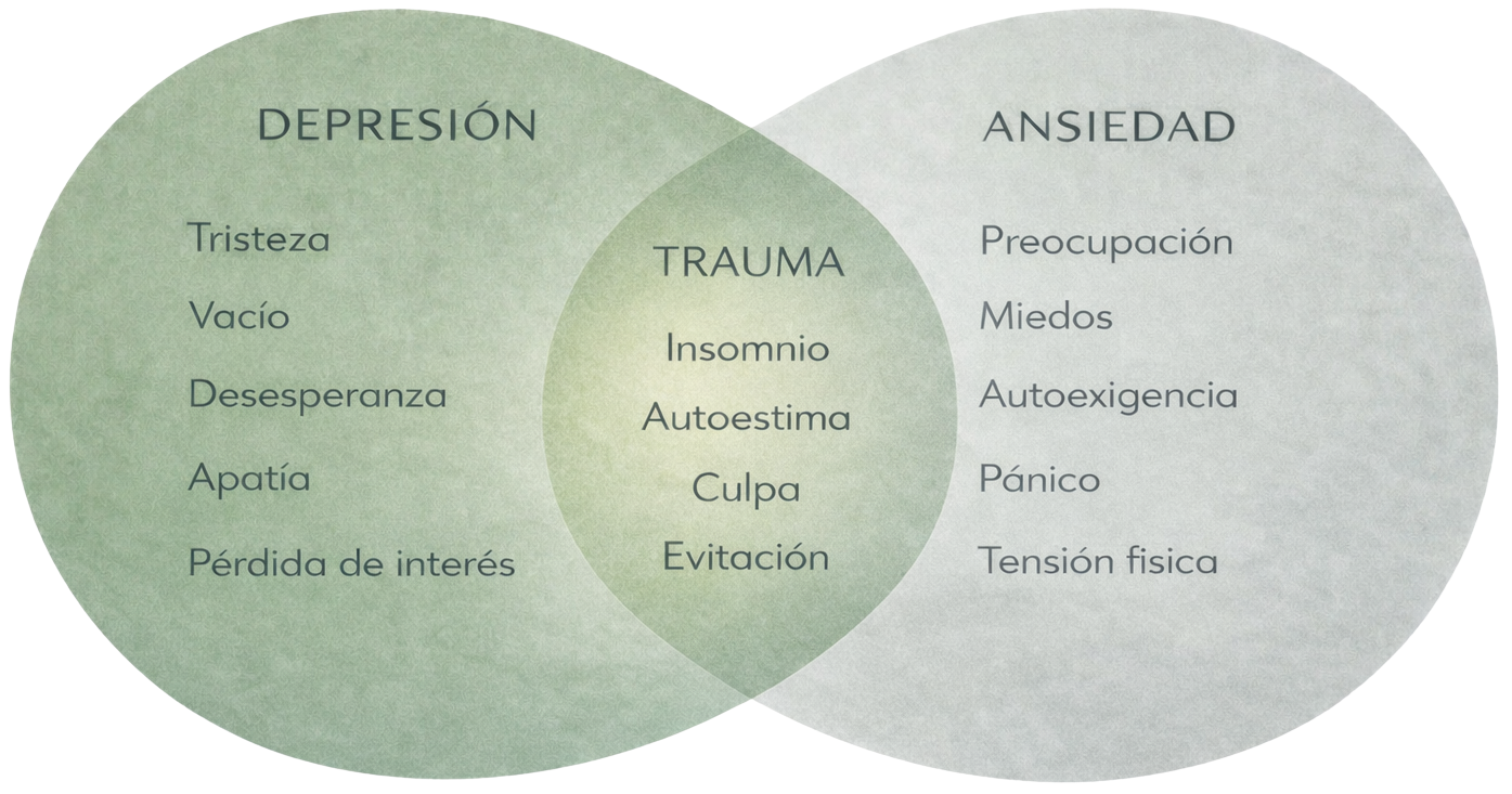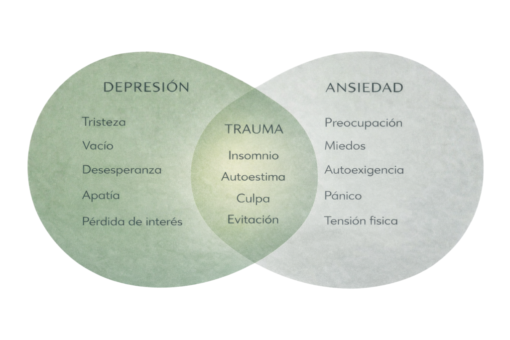 En muchos casos, los síntomas ansiosos y depresivos suelen tener su origen en experiencias traumáticas no procesadas; comprender su relación permite intervenir de forma más eficaz.